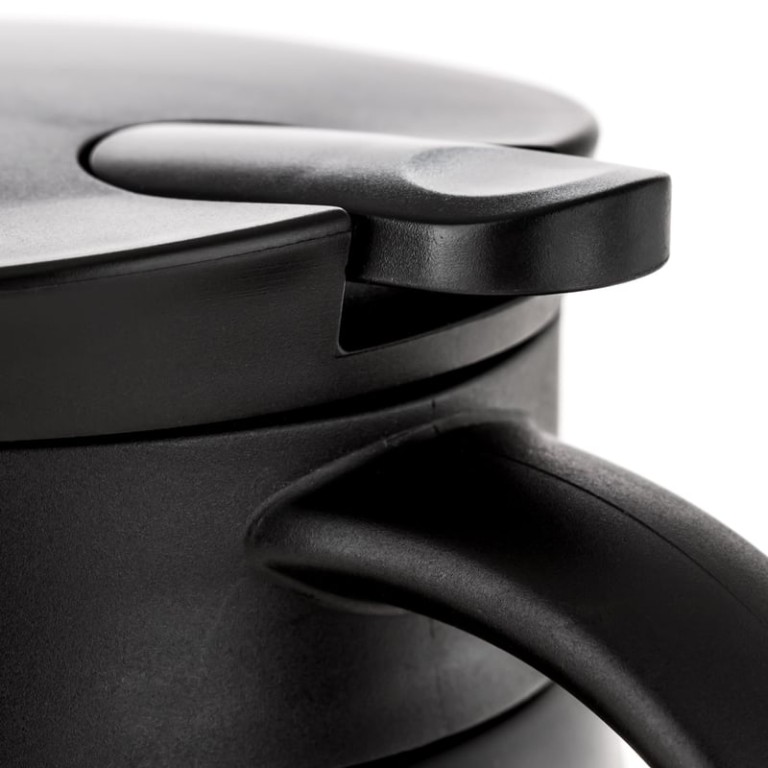 Dzbanek, wykonany ze stali nierdzewnej i tworzywa sztucznego, ma czarny, elegancki design, który wpasuje się w każde otoczenie — od kuchni domowej po obozowisko na łonie natury.